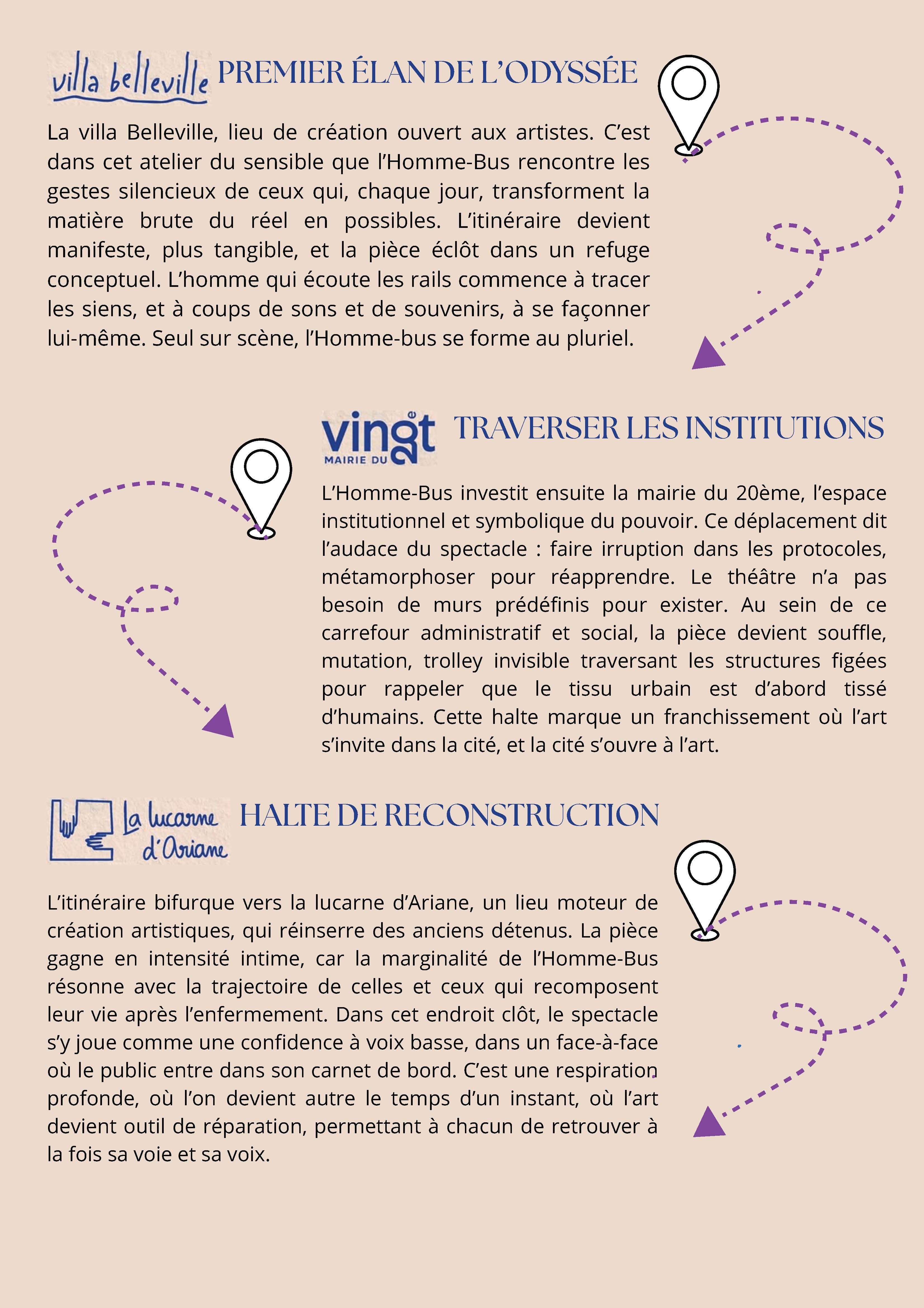 Nina Oukili retrace avec finesse et poésie l’itinéraire de l’Homme-bus et par là-même celui du spectacle.