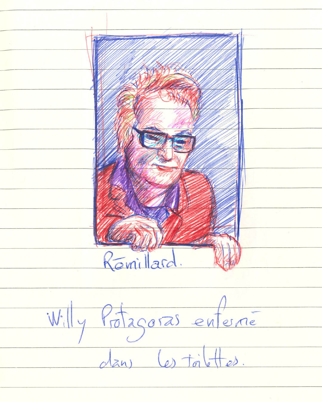 Étrange mélange de sidération et d’excitation. Mélange. Il sera question, oui, de mélange. Un mélange bien subjectif et personnel des répétitions de Willy Protagoras enfermé dans les toilettes. À travers ces quelques notes. À travers mon regard et mes mots, ma vie, celle des autres, de l’équipe, du théâtre, de la Jeune troupe, tout ça. Les allers-retours seront peut-être nombreux. Peut-être pas tout à fait exacts non plus. Les paroles rapportées entre guillemets ne sont pas des citations et ma mémoire pourrait déformer certains aspects.